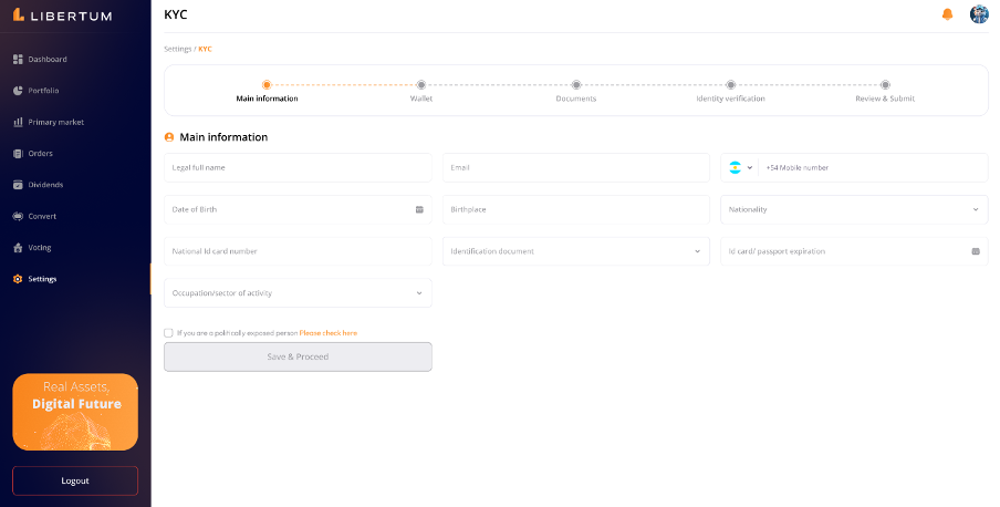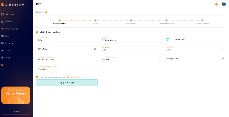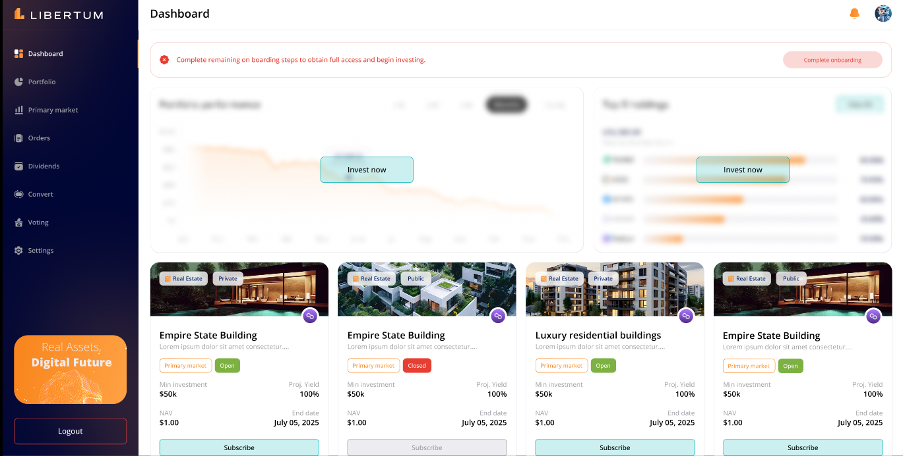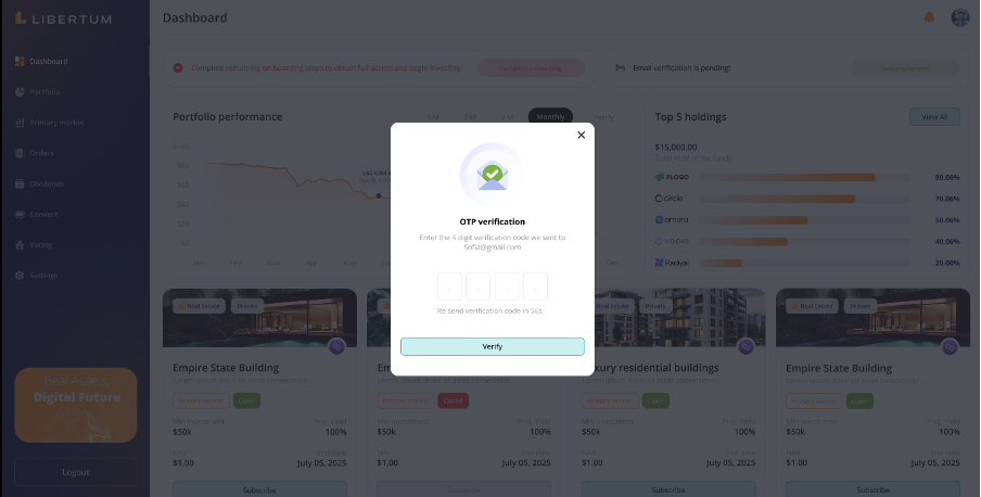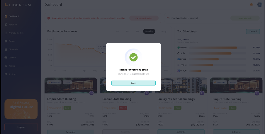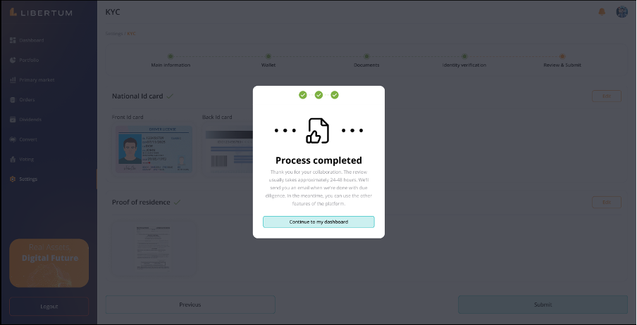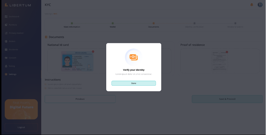 FR:034 The user must click on the “Complete Onboarding” process to complete the KYC of the user to get access to the platform and enable trading/investment on the platform.