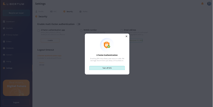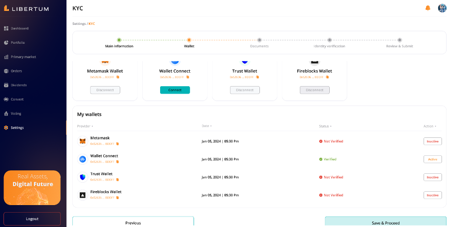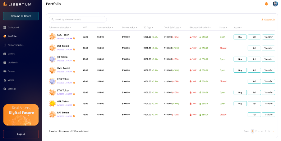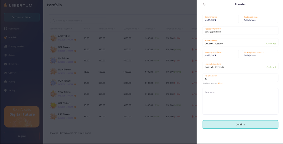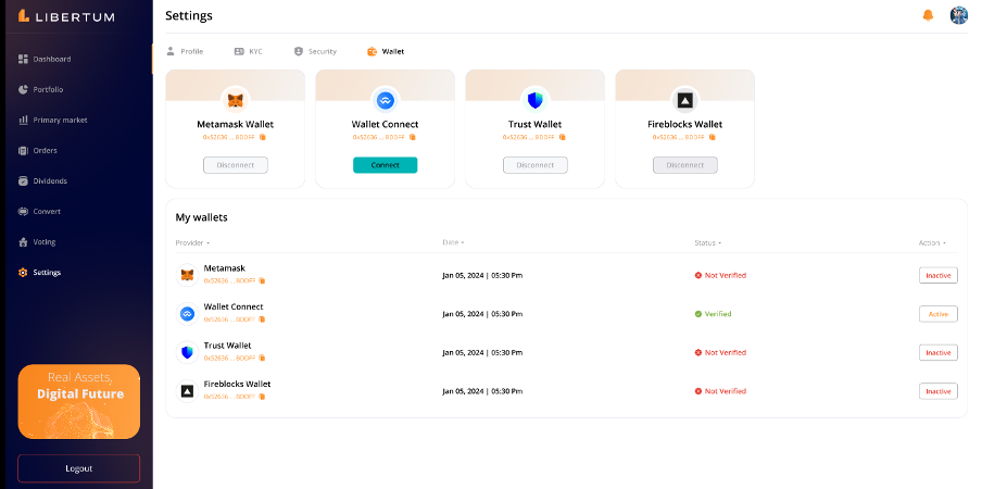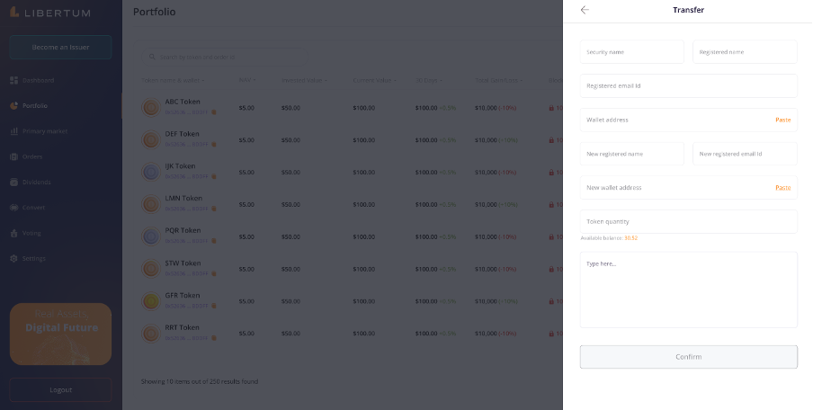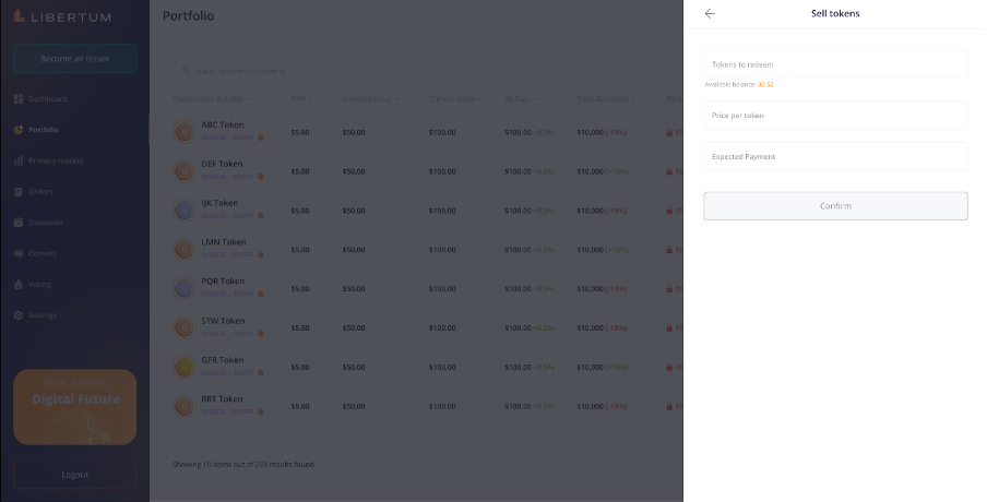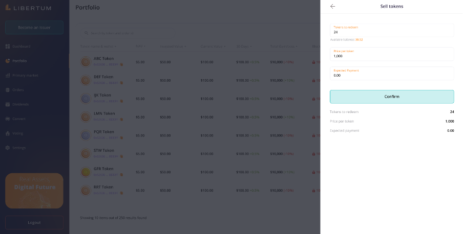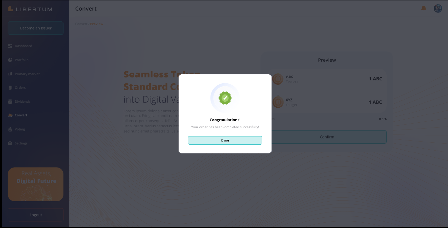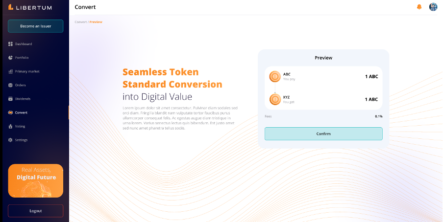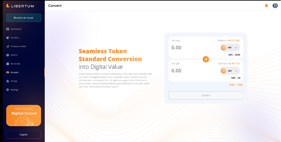 The “Convert” section enables the investors to convert the tokens from the ERC-3643 standard to the wrapped ERC-20 standard, so that they can easily trade the ERC-20 tokens on centralized (CEX) or decentralized exchanges (DEX).