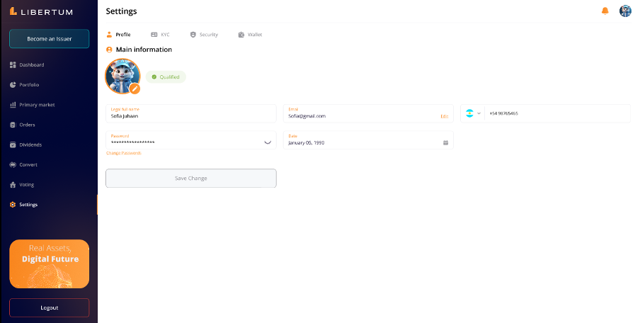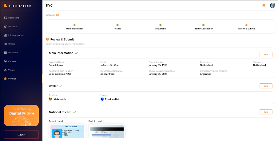 This section is non editable and only allow users to view the information/details submitted by them at the time of KYC to Sumsub, which are as follows-