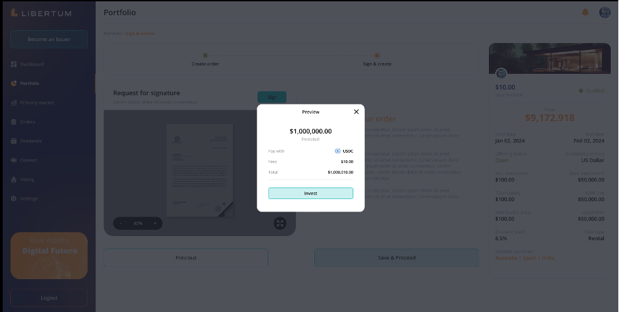 FR:124 The investor must click on the “Confirm” button. Upon clicking “Confirm,” a confirmation modal will appear.