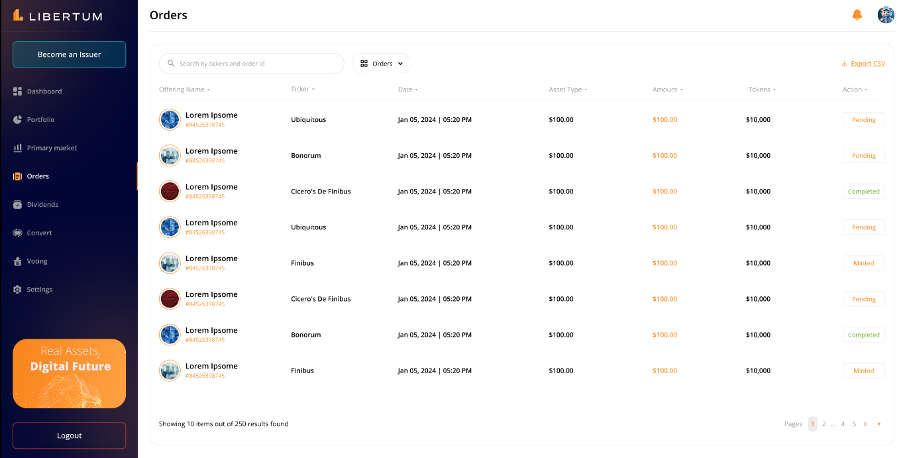 FR:118 The user must click on “Export CSV” to download the CSV file of the orders placed by the investor for record keeping and further analysis.