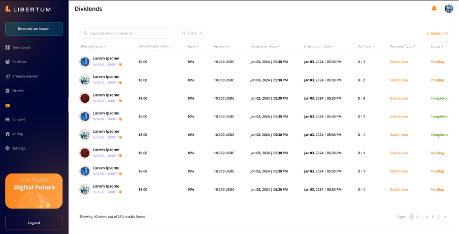 “Dividends” section lists all the dividends received by an individual against various offering that they hold, displaying following informations:
